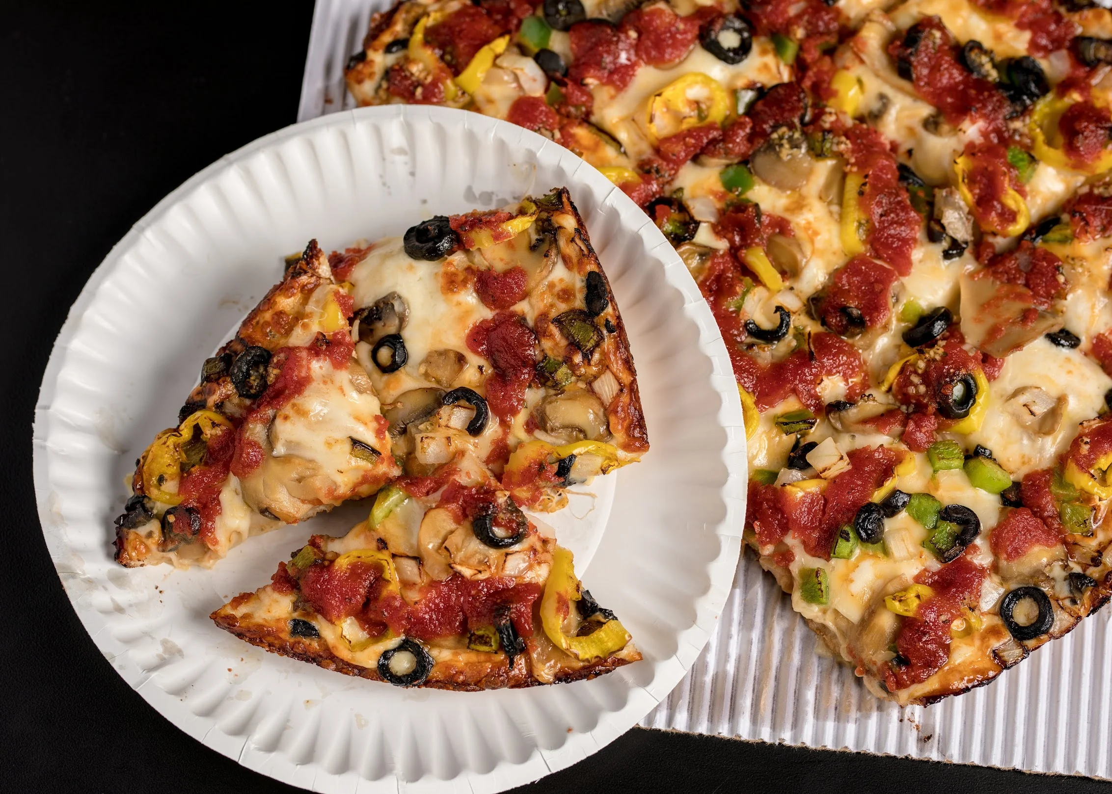 Mushroom, onion, green pepper, black olive, banana pepper